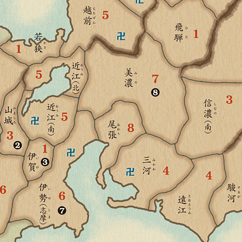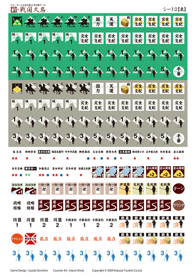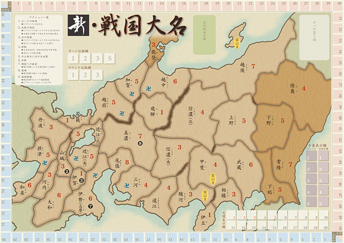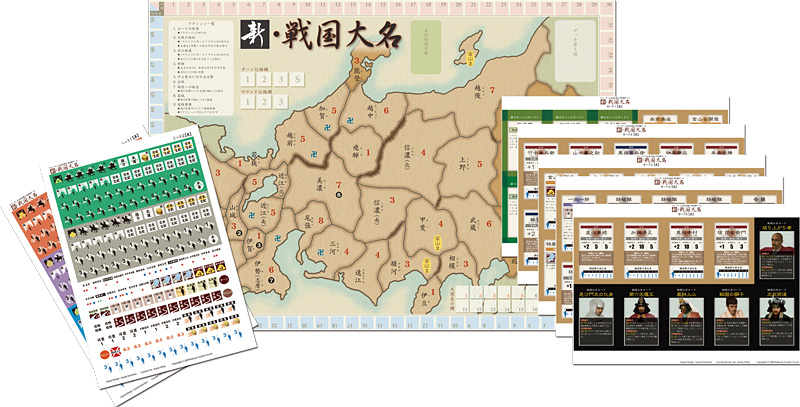 第2号のゲームは、『新・戦国大名』。戦国時代中盤から後半にかけてを舞台に、本州中央部における戦国大名たちが天下統一を目指す戦略級マルチゲームです。80年代に一斉を風靡した名作『戦国大名』が新たなコンセプトでアレンジされ、生まれ変わりました。プレイ人数は4-5名。他人の出方を窺いつつカードを取得し、それらを駆使しながら、領土を安土します。自国を強化しつつ、有名武将を率い、他のプレイヤーの領地に遠征したり、または同盟を結んだりしながら、駆け引きと自分の戦略眼を頼りに天下統一へ邁進するのです。