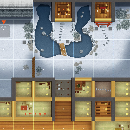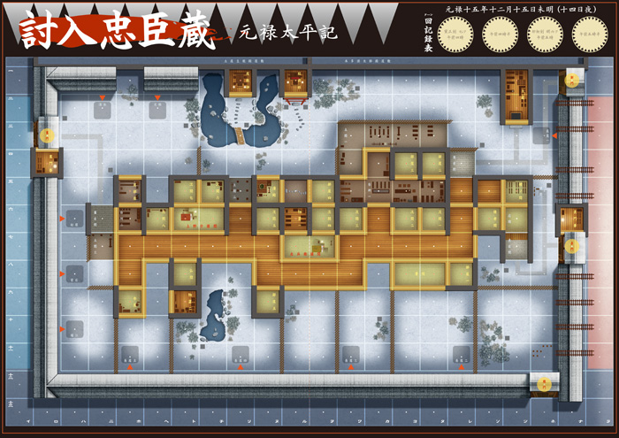 マップには吉良邸の全景が描かれています。戦術級らしく、交互に1スタックずつ動かし、双方がパスするか全駒1回ずつ動かし終わったらターン終了。2時間4ターンしかない上に、赤穂浪士の勝利条件は吉良上野介の討ち取りのみなので、一気に方を付ける気持ちで攻め入らねばなりません。