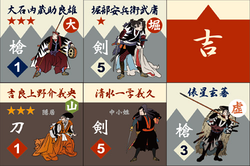 四十七士のカウンターは、全種描き下ろし。表門と裏門から討ち入り、上野介を捜して討ち果たそうとする浪士たち。邸内の障害物を活かして防ぐ吉良方郎党。1人1ユニットで戦う爽快なチャンバラゲーム!