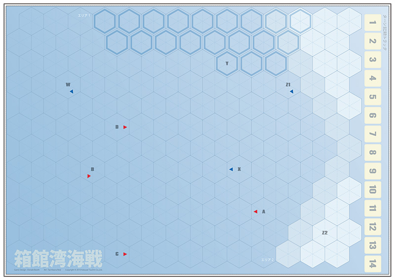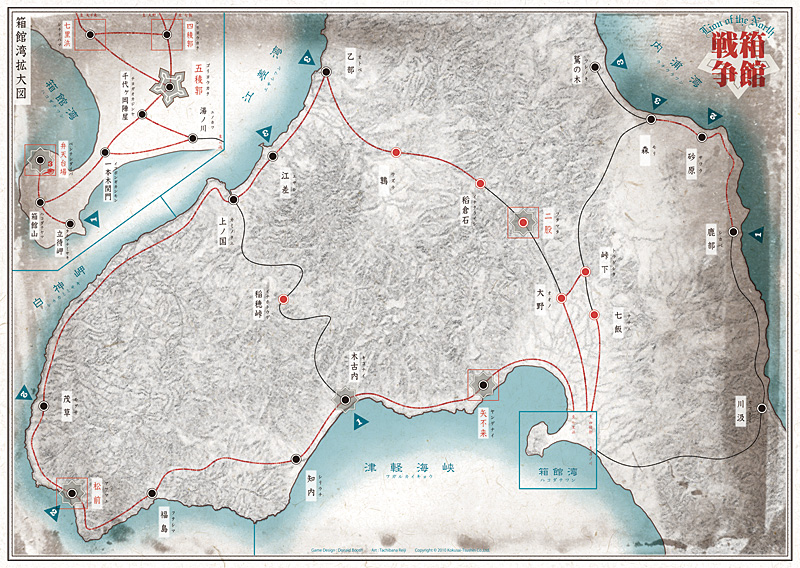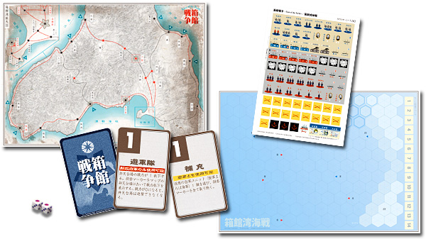 旧幕府軍はゲーム開始前に新政府軍がどこから上陸してくるかを予想してコマを配置します。新政府軍はそれを見て上陸港を決め、上陸します。海戦の要素も盛り込んでおり、近代的な洋上戦が行われた箱館戦争の特徴を表現しました。