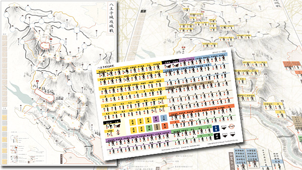 『八王子城攻城戦』は、2人用のウォーゲームです。プレイヤーは天下統一を目前にした豊臣軍と、それを阻止しようと八王子城に籠城する北条軍に分かれて対戦します。本作では戦国時代の臨場感のある山城の籠城戦を体験することができるでしょう。