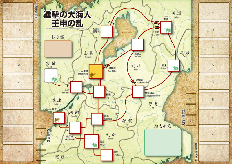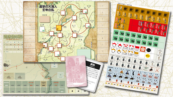 『進撃の大海人:壬申の乱』(しんげきのおおあま:じんしんのらん)は、672年に起きた古代日本史最大の内戦をテーマにした作品です。大海人皇子(後の天武天皇)が入念に準備を行って開戦したという視点で制作されていることから、歴史的なイベントを表す「軍略札」がゲームの流れに変化を与える作品です。