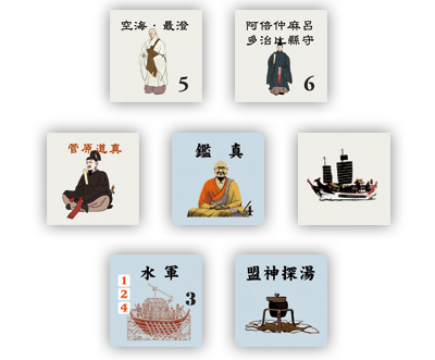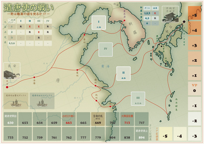 630年〜894年まで行われた唐への遣唐使事業をゲーム化した作品です。一方のプレイヤーは日本を担当し遣唐使を唐へ派遣・帰国させることで得点を得ます。もう一方のプレイヤーは新羅を担当し日本プレイヤーの妨害を行うことで得点を得ます。両陣営の得点差で勝利を競う作品です。