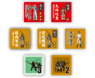 60〜90分程度でプレイできるプレイアビリティの高いゲームでありながら、両陣営が立てねばならない戦略的要素はふんだんに盛り込まれています。史実で敗れた大友皇子陣営が一方的に不利な展開を余儀なくされることは無く、展開によっては大海人皇子陣営の方が不利な状況に追い込まれることも発生します。