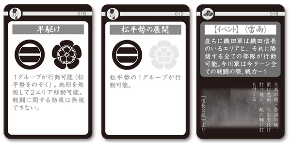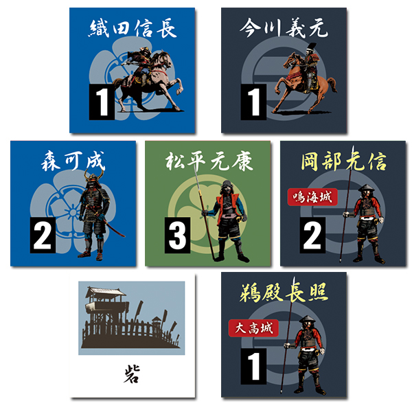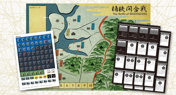 織田軍プレイヤーは城を救援するために前進してくる今川の大軍を前に、タイミングを計りあわよくば今川義元を討ち取ることもできるでしょう。対する今川軍プレイヤーは、数の少ない織田軍の弱点を突き、今川義元に近付く織田信長を含む主力を早期に捕捉し、大軍で始末することも可能です。初期配置やゲーム開始時の手札を選択できるルールを採用しているので、状況に応じた変化に富んだ作戦を立案し試すことのできるゲームです。