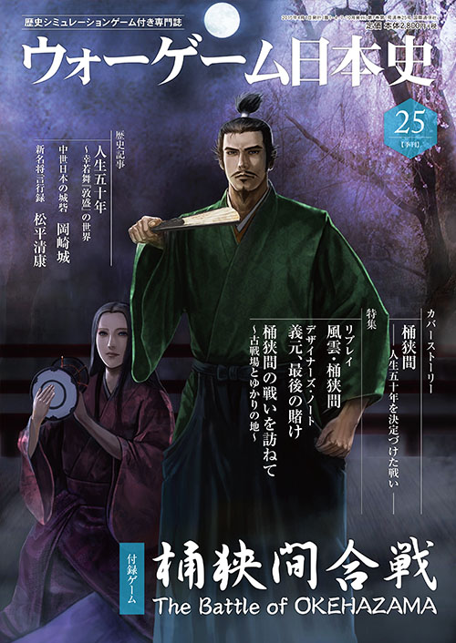 第25号の付録『桶狭間合戦』は、織田信長の名を世に知らしめた「桶狭間の戦い」を体験できる2人用ゲームです。本誌第7号『長篠・設楽原合戦』のシステムを使用し、当時の戦場の様子を織田信長、今川義元の立場で追体験できます。