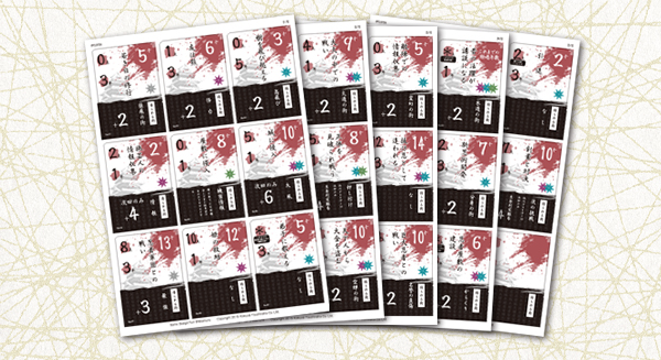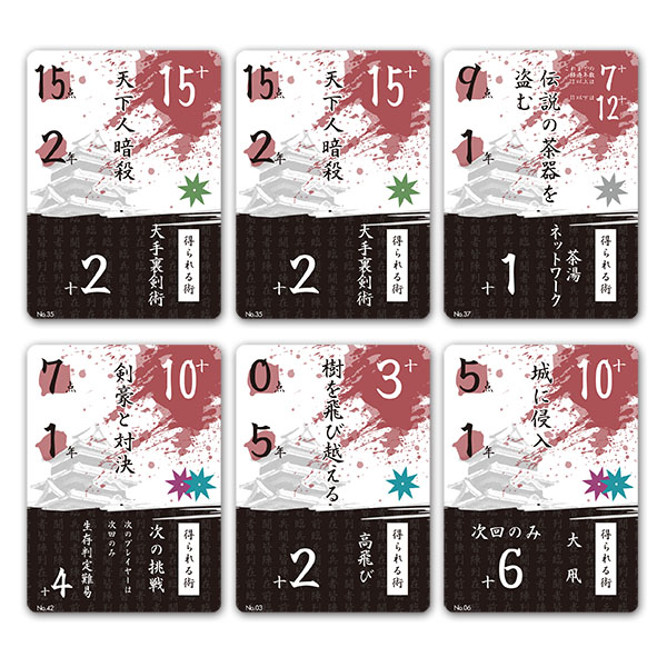 伝説や講談の中に登場する忍者の一生をテーマにした2〜5人で遊べるカードゲームです。プレイヤーは1人の忍者となり、伝説点をより多く獲得すべく人生を送っていきます。