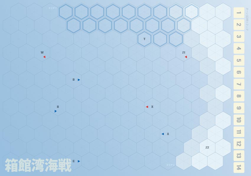 『箱館湾海戦』は1ユニット=1隻の水上戦ゲームで、シナリオは4本。日本初の蒸気船同士の戦いになった「阿波沖海戦」(「開陽」対「春日」の練習用シナリオ)、アボルダージュで有名な「宮古湾海戦」(「蟠竜」が参加するバリアントあり)、仮想戦の「松前沖海戦」(松前城に対する艦砲射撃を企図した新政府軍艦隊に、「開陽」をはじめとする共和国軍艦隊が殴り込みをかける)、そして「箱館湾海戦」(「開陽」が沈まなかったという仮想設定バリアントあり)。