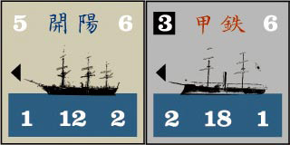 各艦には「砲撃力」「射程」「装甲」「防御力」「移動力」がレーティングされています。「甲鉄」のアームストロング砲や施条砲、小回りの効かない外輪船など、簡単なルールながら各艦の特徴が表現されています。「松前沖海戦」と「箱館湾海戦」では共和国軍の砲台も登場、新政府軍の軍艦と壮絶な撃ち合いが行われることでしょう。